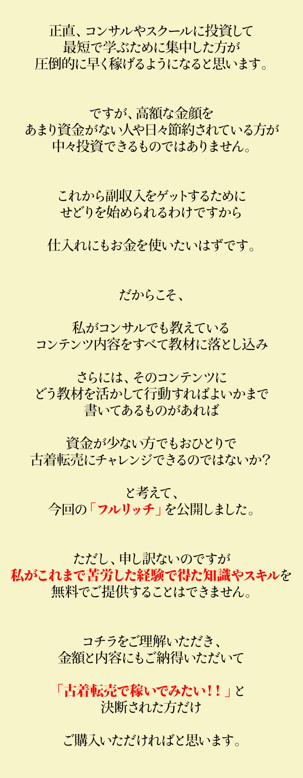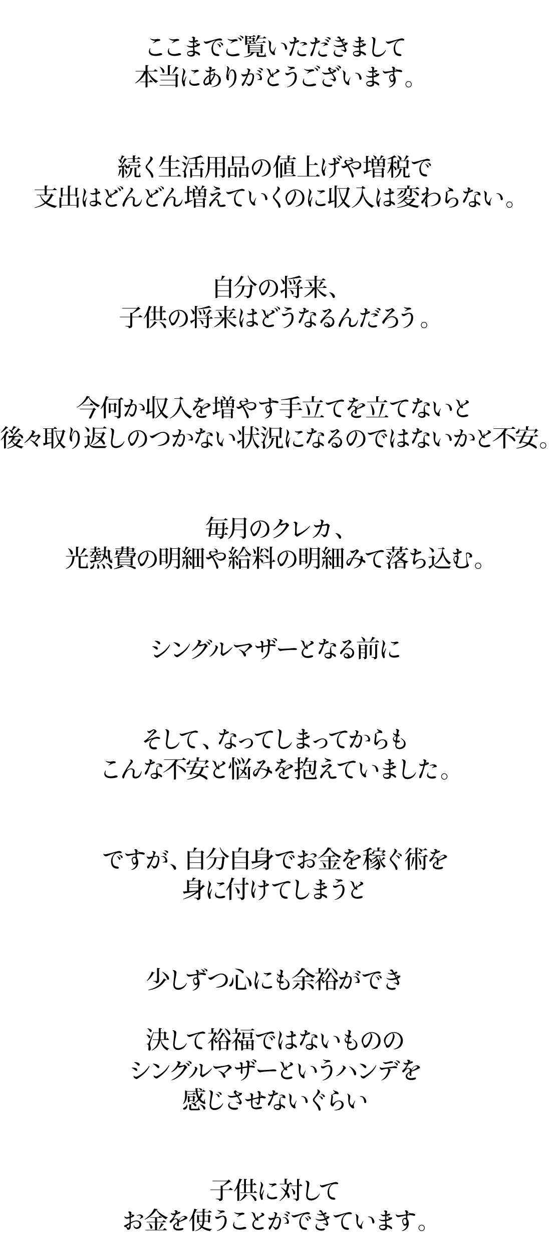 絶対に稼げるということを保証するものではありませんが、知っているのと知らないのとでは限りなく稼げる可能性が異なるというノウハウを詰め込ませて頂いております。 |